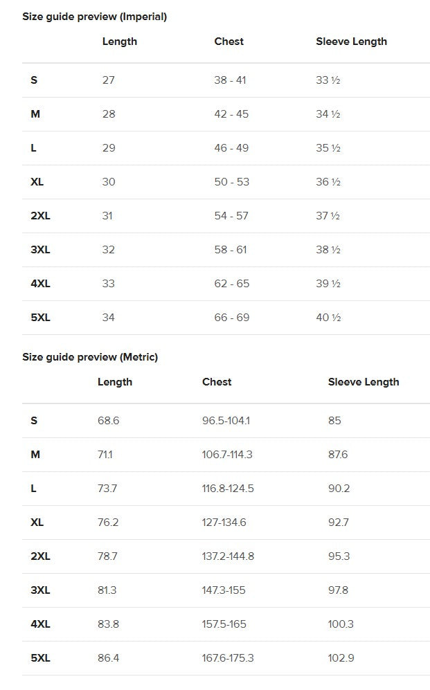 | LENGTH (inches) | CHEST (inches) | SLEEVE LENGTH (inches) | |