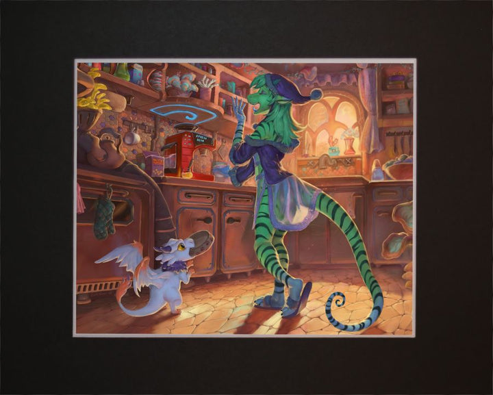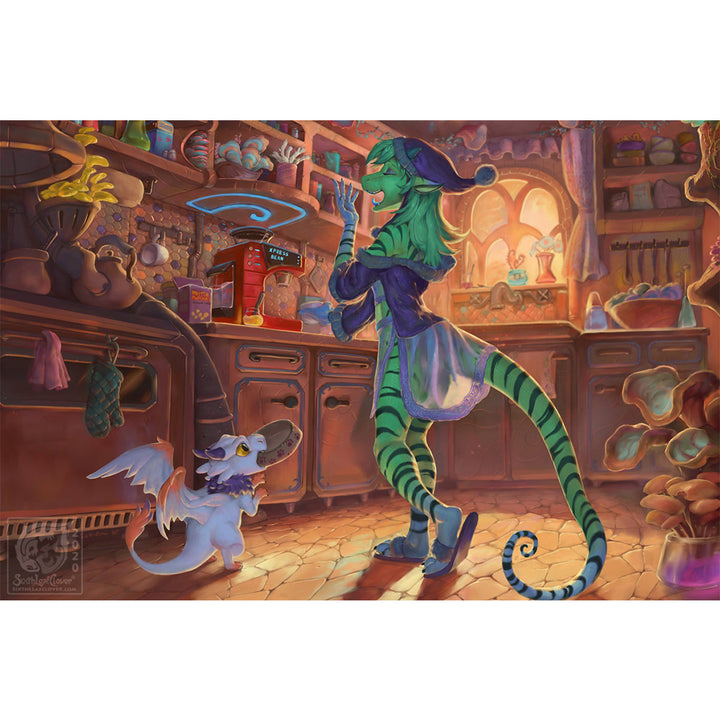 Alice the space lizard is not quite awake as she reaches for her coffee cup to make herself an espresso. Tiny dragon Merphle hold up his food bowl wanting food now!